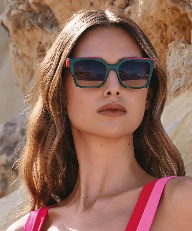 A coleção de óculos de sol estende a elegância suave da Cocoa Mint para o sol, garantindo proteção visual sem sacrificar o charme feminino: