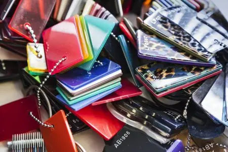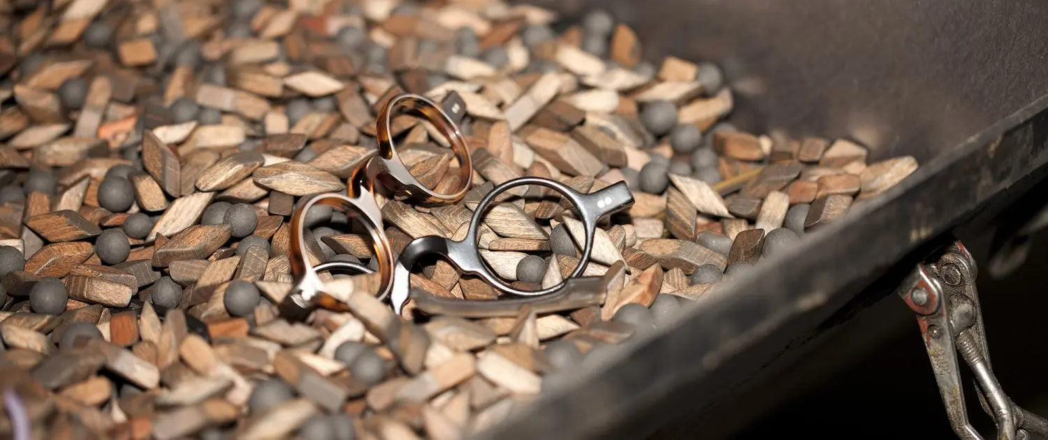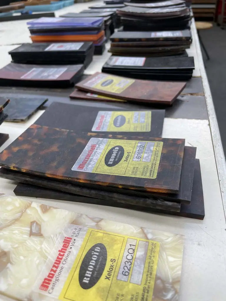 - Acetato Mazzucchelli 1849: A Preciosa utiliza as melhores placas de acetato de celulose, um material derivado do algodão, fornecido pelo prestigiado fabricante italiano Mazzucchelli 1849. Este acetato é trabalhado de forma mais complexa para obter padrões e cores únicos, resultando num brilho autêntico e quente após o polimento.